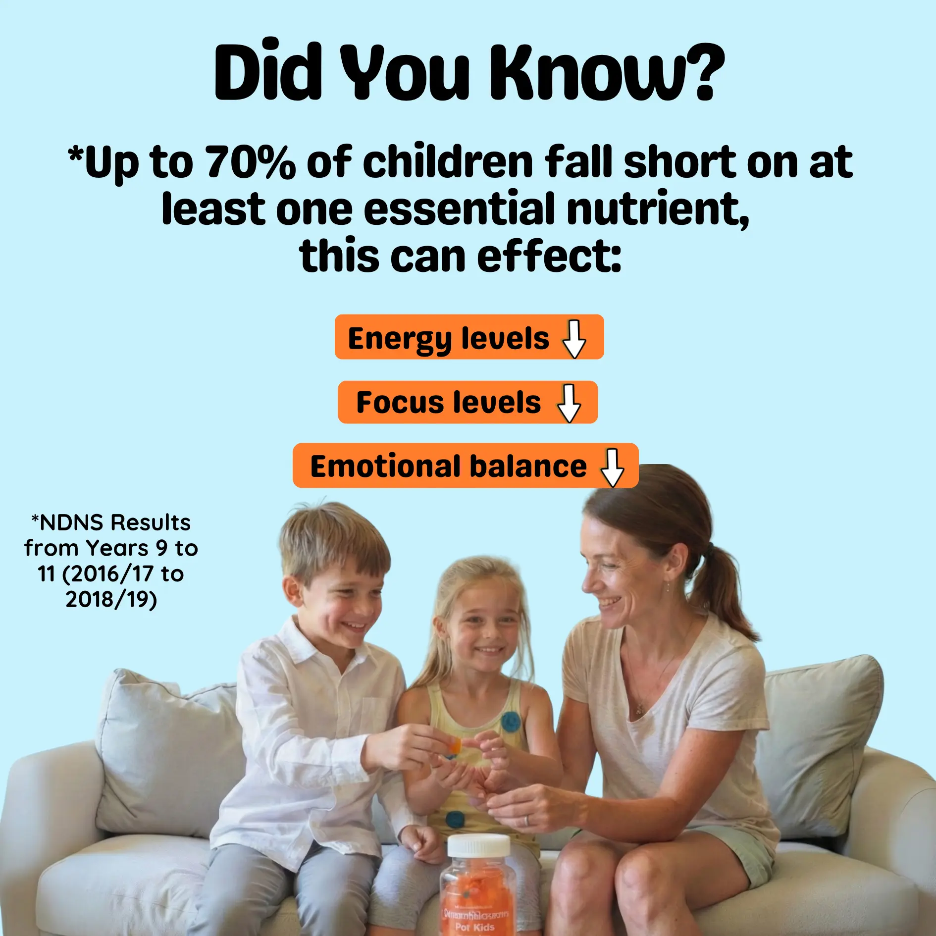 Parents were tired of juggling multiple supplements. So we created one simple gummy, packed with key nutrients that support cognitive function, immune health, and physiological balance.